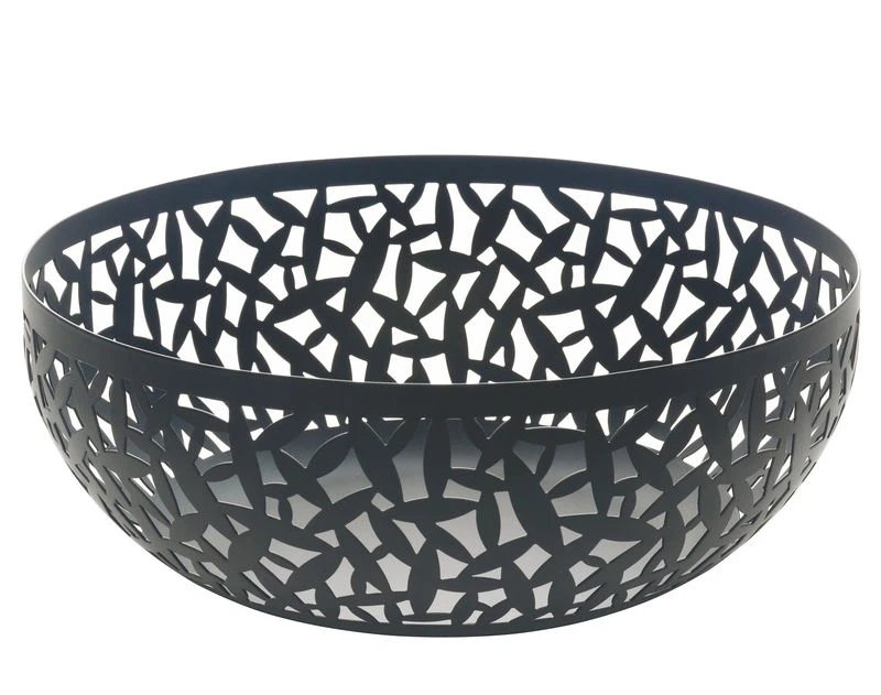 Fruit bowl in steel coloured with epoxy resin, black. The success of the "CACTUS!" range for the table, designed by Marta Sansoni and the Centro Studi Alessi, and in particular our mirror polished stainless steel fruit bowl of 2002, has led us to consider a third colour, conceived with the help of Claudia Raimondo: matte black.