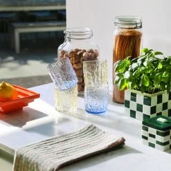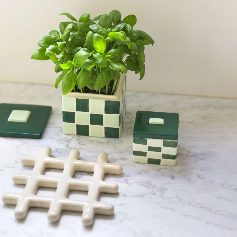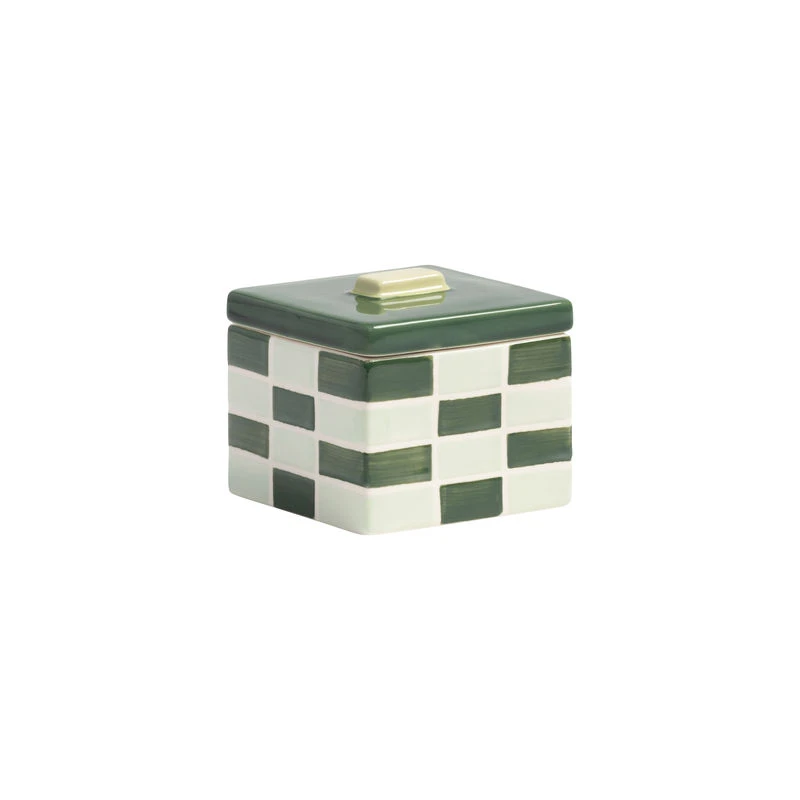 Delightful and bold, this little sandstone box is decorated with a colourful checked pattern. Use it in the kitchen elsewhere around the home.