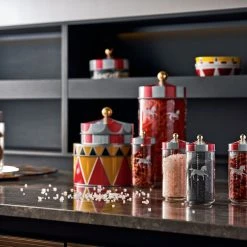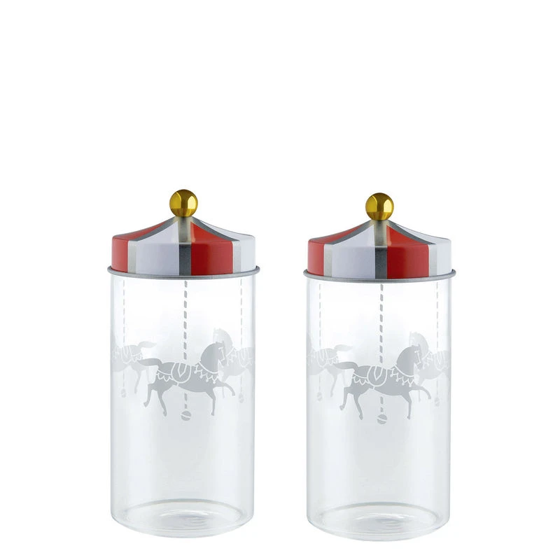Ladies and gentlemen, take your seat under the big top: Alessi’s circus has come to town! The renowned Marcel Wanders has taken his inspiration from the magic of the circus, with its fascinating characters and intense colours, and created a joyous collection, full of humour and expressiveness. The result is a series of objects for the home and the table characterised by repeated geometric patterns: stripes, triangles, diamonds … All in a perfect balance of gay colours that alternate: white, black, red, gold and silver. The various elements are made of a beautiful English porcelain or made of stainless steel and tinplate at the Crusinallo plant in Italy. These elegant hermetic jars will keep your spices and herbs fresh. The tin lid evokes a circus tent. The glass jar is decorated with silkscreen motifs representing carousel horses. Marcel Wanders: “The circus goes beyond life. The glitter and the wonders we see, hear and perceive never leave us. It’s this unique sense of magic that we celebrate with this extraordinary collection.”Set of 2 hermetic jars.