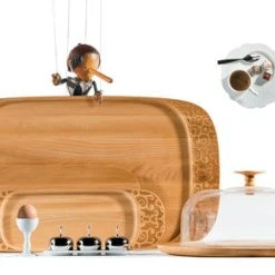 A natural material, beech wood, shaped by artisans, is characterised by knots and veins that make each piece slightly unique. The cake stand can be also used with a domed cover in clear thermoplastic resin with wooden knob. The collection “Dressed in wood”, designed by Marcel Wanders, consists of a personal Breakfast board, a serving board, two trays, a cheese board, a cake stand, a domed cover in clear thermoplastic resin with wooden knob and a big round centrepiece. “Dressed in wood” is a collection made by artisans in Valle Strona, where the production of wooden artefacts is documented as far back as the sixteenth century. This Valley drops down to Lake Orta, where Alessi is headquartered.