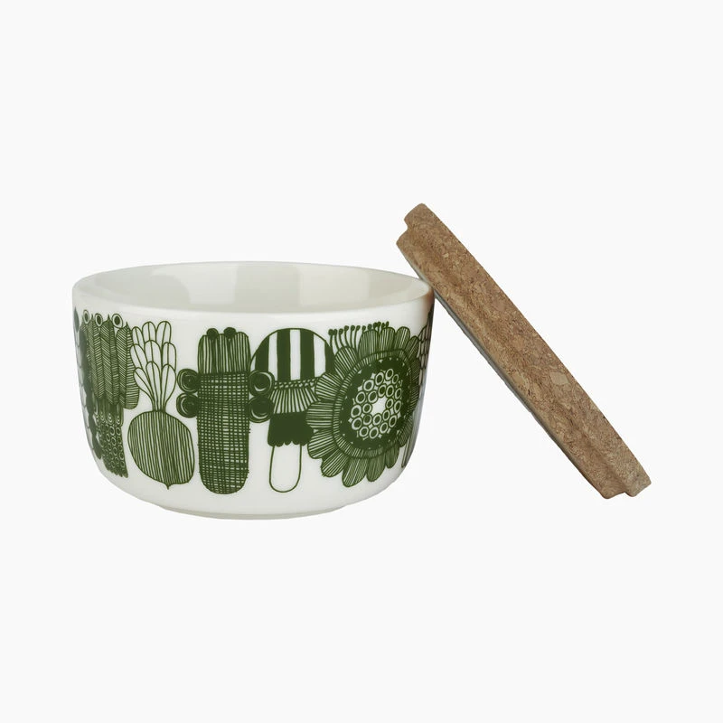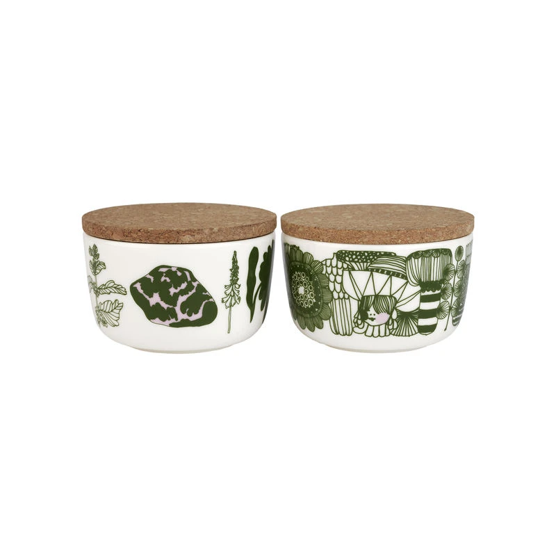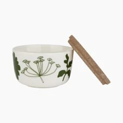 These set includes 2 sandstone pots with cork covers. The pots have two different patterns created by Maija Louekari: the Siirtolapuutarha pattern and the Elokuun Varjot pattern. To create the Elokuun pattern, the young Finnish illustrator found inspiration in her own wildflower garden. The designer was fascinated by the changing seasons in the north – new beginnings and abundantly growing vegetation which grows back year after year. This pattern is a tribute to greenery, freedom and warm breezes. The Siirtolapuutarha depicts the saturated abundance of an urban cottage garden. The flat colour tints and freehand lines are typical of the Marimekko collection. Cheerful, chic and graphic, the Marimekko accessories collection brightens up your interior! The simple shapes showcase the collection’s stunning designs. You can compose a coordinated service yourself, or mismatch cups, plates and bowls to create your own style! Created in 1951, Marimekko is a state of mind, a way of life based on creativity, freedom of spirit and inventiveness. Its notoriety dates back to 1960, the year in which Jackie Kennedy made several public appearances in dresses designed by Marimekko. The brand went on to enjoy enormous success, which continues today with a range of clothing and decorative accessories in vibrant colours, for a house full of inspiration!
