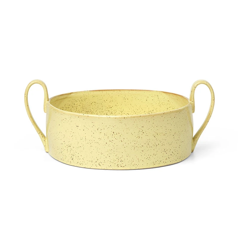 A neo-rustic style for this tableware collection made from glazed porcelain with a mottled finish. The simple, sleek, curved shapes are typical of Nordic design. This bowl is embellished with two large handles which make carrying easier and give it character. Suitable for food contact, it can serve as a fruit basket. You can also use it to present your dishes in a very trendy rustic style.