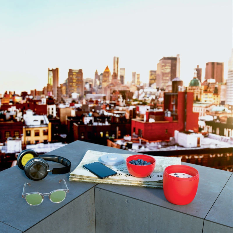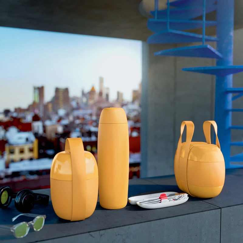 Created by the Japanese designer, Sakura Adachi, Food à porter is a lunch box designed as a fashion accessory. The name expresses both the object’s function and its decisive aesthetic value: a wonderful object to showcase and carry like a sophisticated minaudière. Food à porter contains your lunchtime meal or a snack like you have prepared it at home, allowing you to then eat it wherever you want! In the office, at school, in a park, etc. Food à porter is part of Japanese culture: the bento box in which lunch is placed with care and in a visually attractive way and lacquered objects are evoked by the alternating shiny and opaque surfaces of the three containers which make it up. This lunch box consists of two containers made from thermoplastic resin equipped with two lids with silicone seals. Between the two containers, there is a removable refrigerating element which lets you maintain the temperature for approximately 4 hours. The upper container’s capacity is 200 ml and the capacity of the lower one is 500 ml.This large-capacity lunch box is compact and extremely versatile due to its two lids and the option of inserting the refrigerating element. It can be used to carry a variety of food: salad, yoghurts and cereals, pasta, soups, etc.The two containers are held together via a silicone strap which makes carrying it easier and turns the lunch box into an elegant minaudière. To reheat the food in the containers, only a microwave can be used. On the lids there is a small opening, sealed by a little silicone stopper, on which the cooking times to not exceed are indicated. Before inserting the container into the microwave, you need to open the stopper such that the steam can leave during reheating. The little stopper can also be opened to make removing the lid which hermetically seals the container easier.