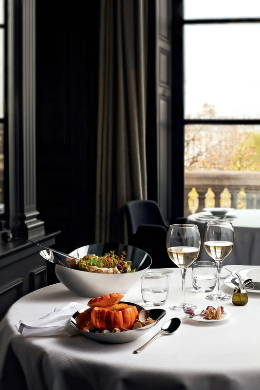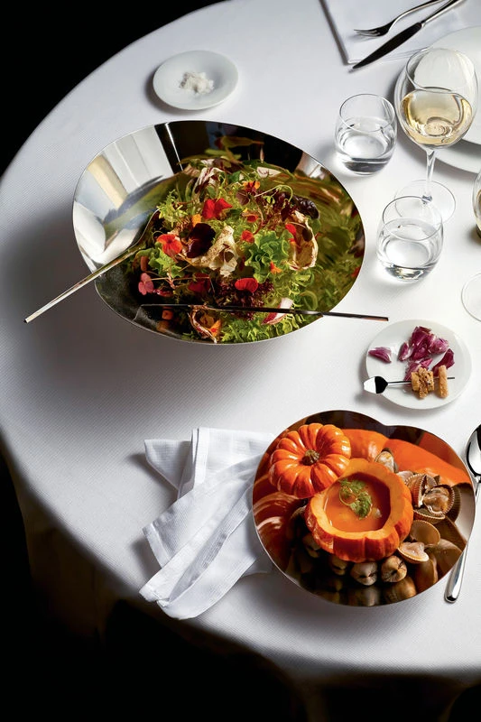 The salad bowl belongs to the Human collection: the result of the partnership between the French designer Bruno Moretti and Michelin-starred chef Guy Savoy. This partnership stems from their joint passion for research, quality materials and harmonious presentation. The salad bowl represents an algebraic curve that resembles a flattened-out leaf or a heart. Elegant lines that open out generously towards the exterior make it possible to arrange and present every recipe while respecting the texture and fragility of the ingredients. It's volume allows to mix the ingredients nicely and carefully.
