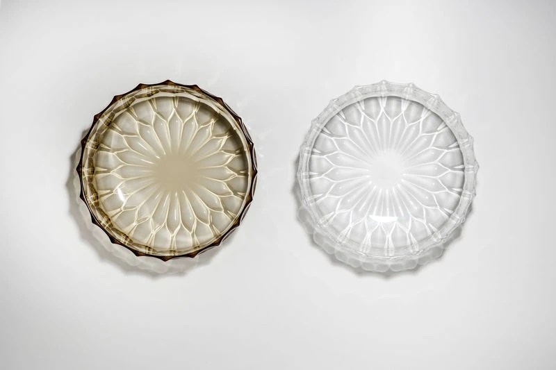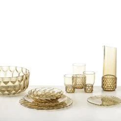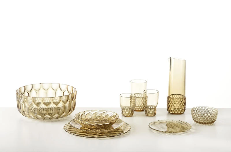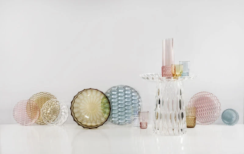‘Jellies Family' is a line of plates, trays, glasses, bowls and carafes made of brilliant coloured and transparent PMMA designed by Patricia Urquiola, part of a designer series of tableware for Kartell known as Kartell in Tavola. “The particularity of the line lies in the fact that each plate model has a different pattern of clear naturalistic inspiration” says Kartell. “The transparent, subtle and delicate colours combine easily and can result in a variegated table of creative and original inspiration – just, in any case, like the style of the Spanish designer. The mixing and matching of plates and colours create an original but discreet impression, a blending of the creative and the sophisticated.