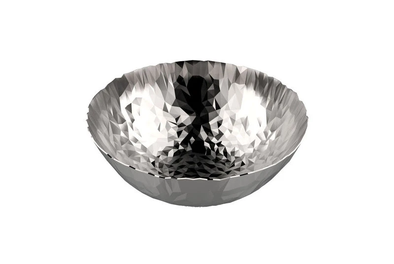 A sheet of steel becomes form and decoration: Joy, like a jewel, a pleasure. Alessi Joy in 18/10 steel. The designer has designed a piece with embossed sides and an uneven, jagged rim. The irregular texture creates a fascinating play of light that enhances the object, invoking the image of master silversmiths’ machined surfaces.