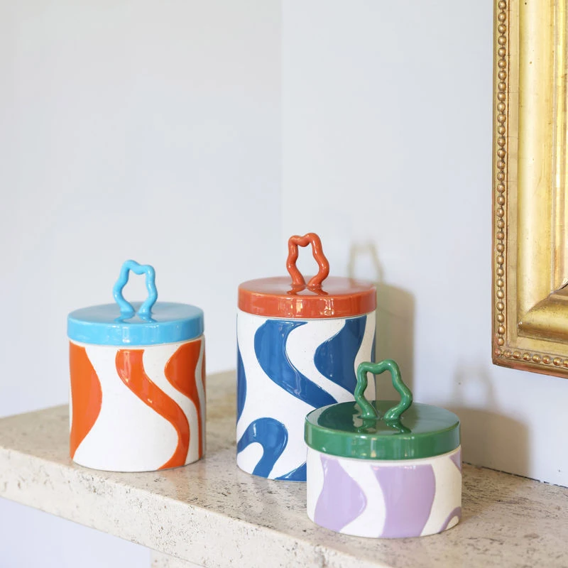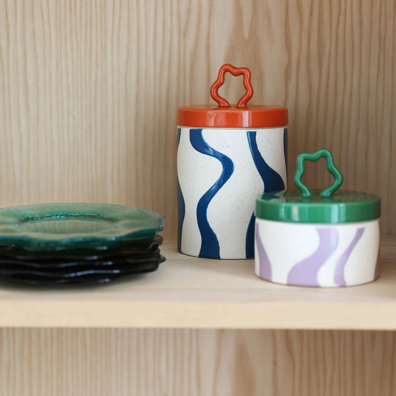 This retro box is decorated with colourful, undulating patterns oozing seventies style. With its original handle and stunning colour palette, this box can be used in the kitchen to store food, or elsewhere in the house to store small objects.