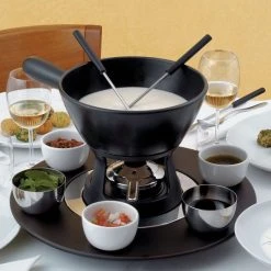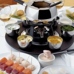 A fantastic wood turning tray with small stainless steel and ceramic bowls Ideal with fondue set.