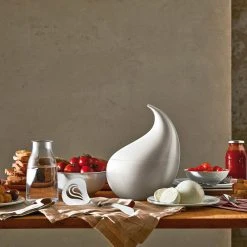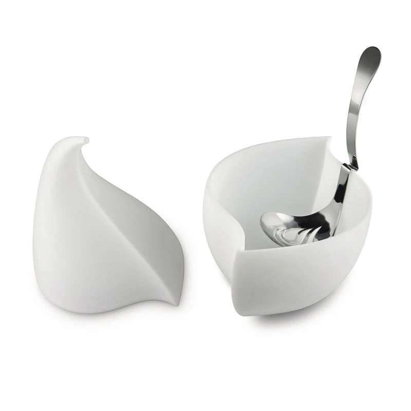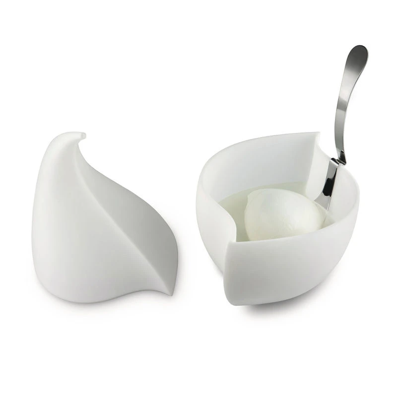 "Alessi and the Consortium for the Protection of the Mozzarella di Bufala PDO are coming together for an original and fun project which combines design with a symbol of Italian gastronomic excellence. Culture and tradition meet in this Nunziatella mozzarella service set with a sophisticated and evocative design. The cooling container made from white thermoplastic resin combined with its slotted spoon made from steel let you serve the mozzarella and keep it in the fridge completely elegantly. An innovative object which comes out of the need to give an account of the beauty and bounty of Italy, while promoting the history of an ancient product, exported throughout the world, via a contemporary interpretation. The cooling container is designed to contain a traditional 500-gram mozzarella and its liquid (or pieces of a lesser weight). For optimal preservation, the liquid must be equal to the volume of mozzarella. The steel ladle, to collect, drain and serve the mozzarella has an ""S"" shaped handle so it can be hung on the edge of the container. The steel skimming ladle lets you extract the mozzarella with all the care required, while keeping the outer part intact in order to avoid the buttermilk (which is rich in flavour and the main characteristic of this unique and special food) contained inside from coming out. The designer, Emma Silvestris, has designed a container in an evocative shape with a milky whiteness. At first glance, the container looks like a buffalo horn, then looking closely, the shape of a large drop of milk, sweet and well-rounded, appears, typical of the mozzarella ball. Emma Silvestris wanted to get across the love of her land and its excellent produce in her creation, which honour her all over the world.