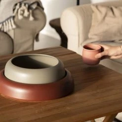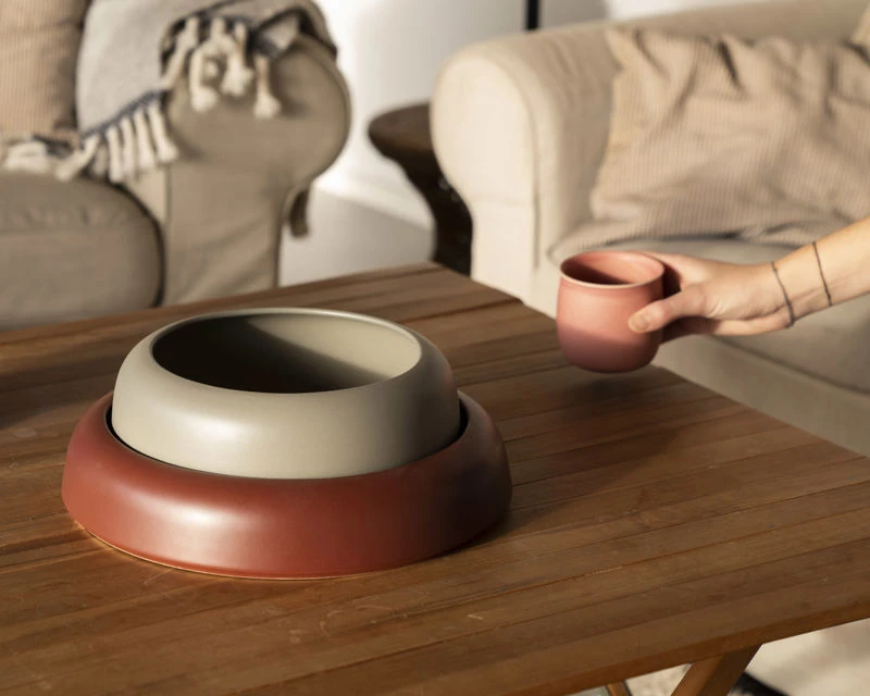 The Omar collection is the result of a collaboration between the Danish design brand raawii and Omar Sosa – founder of Apartamento magazine. These ceramic pieces are made and glazed by hand in Portugal. In this project, characterised by its sculptural approach, the different elements are lavishly superimposed: so the two different-sized bowls can be stacked together. Surprisingly modern, the sleek silhouettes are given a twist by a rich colour palette, inspired by nature. Coming straight from a watercolour palette, these ceramic items sport a blend of joyous intensity, remarkable restraint, poetry and geometry. The balanced, refined forms give this collection an incredibly graphic aspect. This modern, elegant bowl is perfect for presenting food. It can also be used as a trinket tray. One of the key points of the Raawii collection is quality. The Raawii brand is committed to production that respects people by offering optimal conditions to its employees, craftsmen and designers. Designer Omar Sosa: “In making these products, we placed our trust in an instinctive process. Working with a lathe, the round shapes came naturally, there was no need for computers. We saw the articles rise from out of the material. I think this work was first and foremost a labour of love and detail: we focused a lot on the proportions, which are everything to us. We didn’t work by trial and error, but rather by relying on instinct. Maybe that’s why, in the pieces we created, I feel a kind of primitive energy. I don’t want people to think that we created these items for a specific purpose. Everyone can use them as they see fit – to put a salad in or feed their dog, it doesn’t matter.’’ Note: all items are handmade and glazed in Portugal. This may result in small variations due to the craftsmanship, making the final product charming and unique.