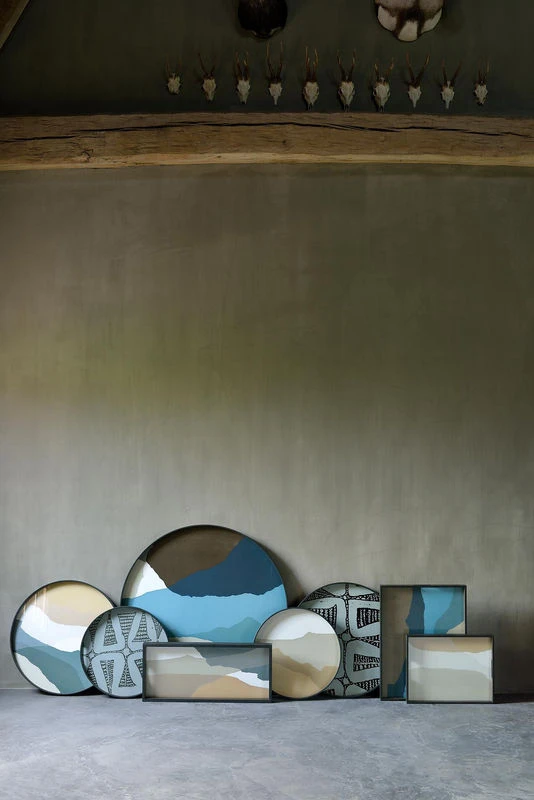 Folk, bohemian and chic all at the same time, the collection of Ethnicraft trays is designed by the American artist Dawn Sweitzer. His sources of inspiration are many and varied: her childhood in the great outdoors of Ohio, her curiosity for life and many travels around the world… Dawn has collected images and sensations that she transcribes on different media in the form of extremely rich pictorial compositions. A free vision inspired by Dawn's abstract paintings combines with an expressive colour palette. The result is a union of unexpected nuances of muted, saturated hues and luxurious details. This screen-printed glass top is hand-painted. The edge is made of dark wood.