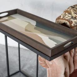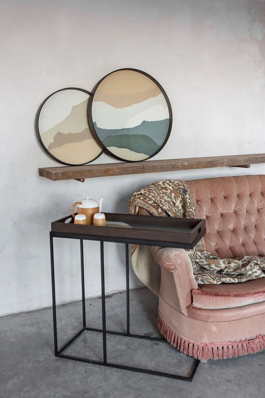 Folk, bohemian and chic all at the same time, the collection of Ethnicraft trays is designed by the American artist Dawn Sweitzer. His sources of inspiration are many and varied: her childhood in the great outdoors of Ohio, her curiosity for life and many travels around the world… Dawn has collected images and sensations that she transcribes on different media in the form of extremely rich pictorial compositions. A free vision inspired by Dawn’s abstract paintings combines with an expressive colour palette. The result is a union of unexpected nuances of muted, saturated hues and luxurious details. This long screen-printed glass tray is hand-painted. The edge is made of dark wood.