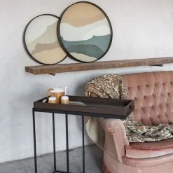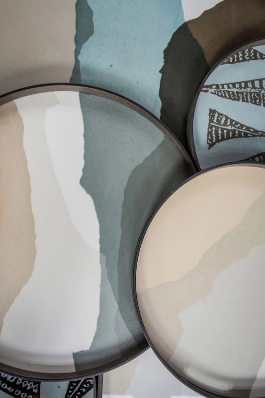 Folk, bohemian and chic all at the same time, the collection of Ethnicraft trays is designed by the American artist Dawn Sweitzer. His sources of inspiration are many and varied: her childhood in the great outdoors of Ohio, her curiosity for life and many travels around the world… Dawn has collected images and sensations that she transcribes on different media in the form of extremely rich pictorial compositions. A free vision inspired by Dawn’s abstract paintings combines with an expressive colour palette. The result is a union of unexpected nuances of muted, saturated hues and luxurious details. This screen-printed glass top is hand-painted. The edge is made of dark wood.
