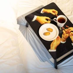 Maurizio Cattelan, an unavoidable figure in contemporary art, and photographer Pierpaolo Ferrari have created this capsule collection for Seletti. Unlike any other, it’s provocative, amusing, absurd and eccentric all at once. The items in this collection are decorated with surrealist images taken from the Toilet Paper magazine, founded in 2010 by two Italian artists. Perfectly manicured cut-off fingers, soap with a bite taken out of it, fish stuffed with precious gems, a canary with a cut-off wing, and more. Dreamlike Toilet Paper motifs tinged with black humour inspired by the worlds of fashion and advertising, combining commercial photography, twisted visual narratives and surreal imagery. Toilet Paper questions our contemporary obsession with images, explores our most unspeakable desires and urges. All the items in the Toilet Paper collection present startling scenes, mixing disturbing normality and troubling ambiguity, stirring feelings of horror combined with visual pleasure. A work of art in itself, the Toilet Paper collection questions, due to its accessible price and wide distribution, the nature and limits of the contemporary art market. This questioning has always been central in Maurizio Cattelan’s work. This large tray with folding legs is perfect for breakfasts in bed, meals on the sofa or serving refreshing drinks in the garden. It’s true – this Toiletpaper tray will attract all the attention!